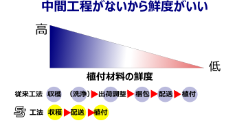 ソッドシュレッダー工法では、切芝の収穫から施工現場まで、土又は砂が付着した切り芝(ソッド)の状態で植付材料が輸送されます。ソッドは現場で植付け直前に解きほぐす為、乾燥などのリスクや芝への負荷(移植ストレス)を最小限に抑え、より新鮮、切りたてフレッシュな芝を安全迅速に植え付けることが可能となりました。