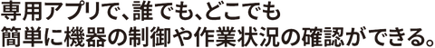 遠隔操作によるロボットの制御、動作状況の確認、異常を検知した場合のプッシュ通知確認、作業進捗率の確認などが可能。